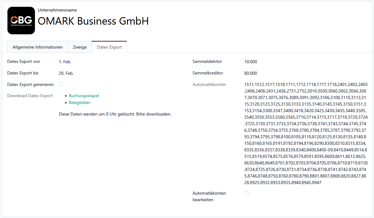 Die Bedienung integriert sich direkt in die Unternehmensmaske von Odoo. Der Export ist genau dort verfügbar, wo zentrale Unternehmens- und Buchhaltungsdaten ohnehin gepflegt werden — ohne zusätzliche Menüpunkte, ohne Umwege, ohne Sonderprozesse. Automatikkonten können individuell gepflegt werden.